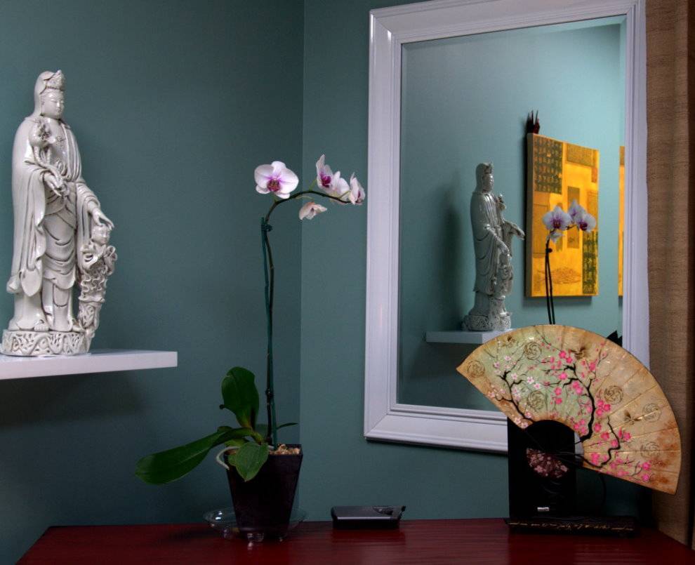 Популярное учение фэн-шуй тоже не обошло отражающие поверхности своим вниманием, отводя им особенную роль в любом интерьере. Зеркало с одинаковой невозмутимостью умножает богато накрытый стол с красивой посудой и унылое дверное полотно или кирпичную стену