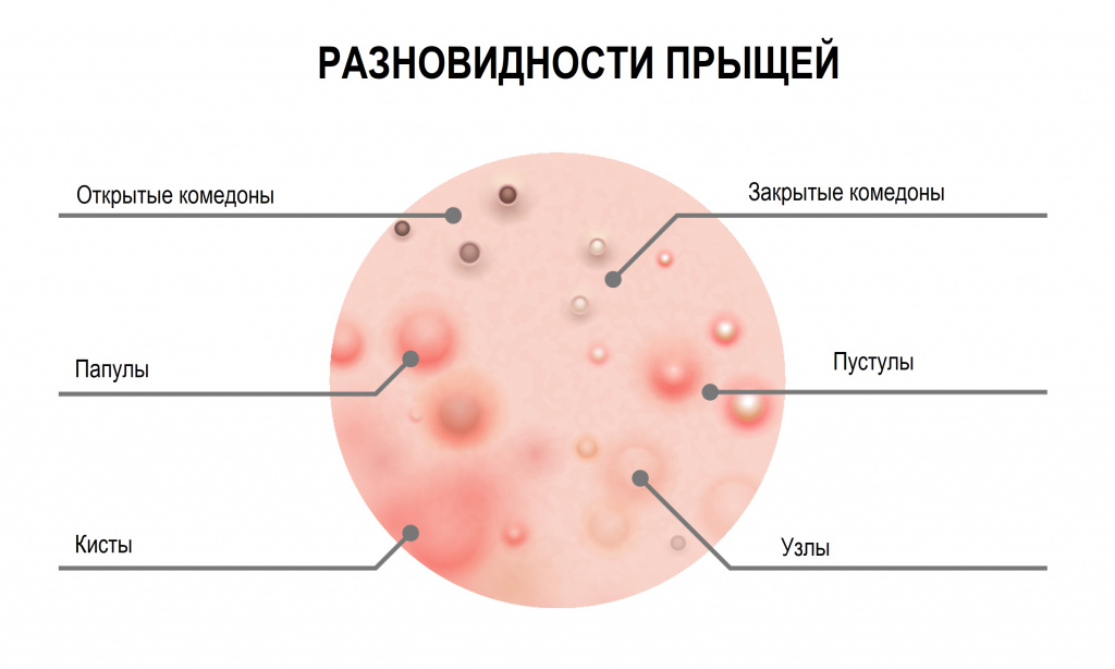 Прыщи делятся на несколько видов, объединенных в две основные группы. Первая группа — это воспалительные гнойные высыпания красного цвета.
