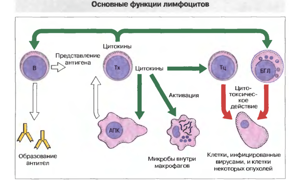 Лимфоциты являются главными клетками иммунной системы. Они способствуют активации эффекторных механизмов, регулируют процессы дифференцировки клеток и синтеза ими необходимых веществ (цитокинов). Главная функции этих клеток – запуск иммунного ответа в ответ на внедрение патогенного агента, который может быть представлен вирусом, бактерией, грибом или простейшим. Аллергическая реакция тоже основана на взаимодействии лимфоцитов и аллергена.