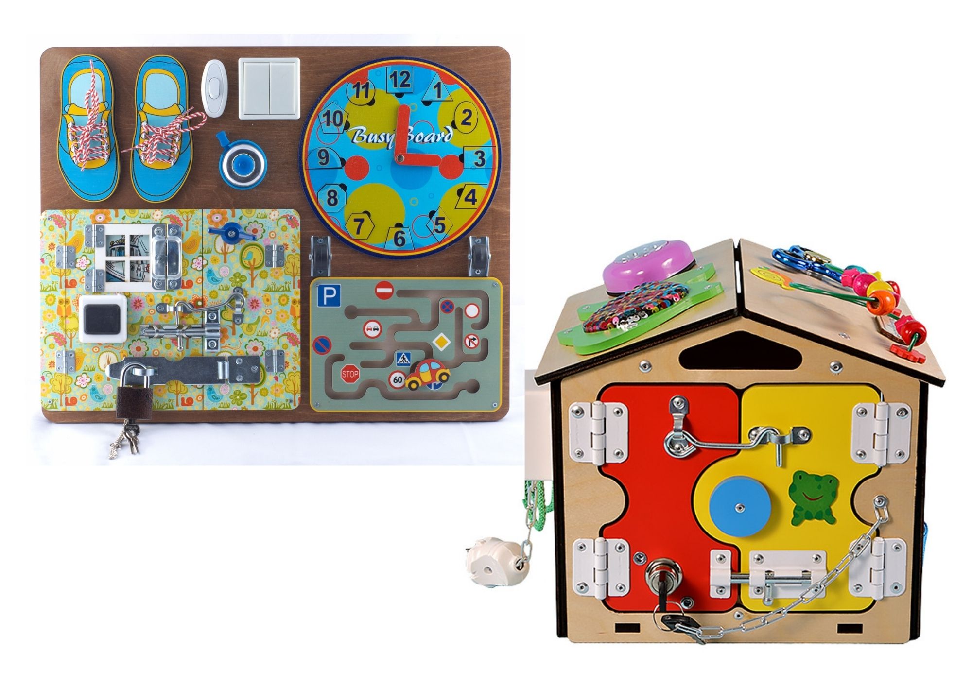 Чаще всего на бизибордах закреплены шпингалеты, крючки, шестеренки, имитация розеток и выключателей. Вместе с ними находятся лабиринты, шнуровки, открывающиеся окошки. Такое многообразие надолго увлечет малыша и научит обращению с бытовыми предметами. Бизиборд развивает мелкую моторику, логическое мышление, координацию