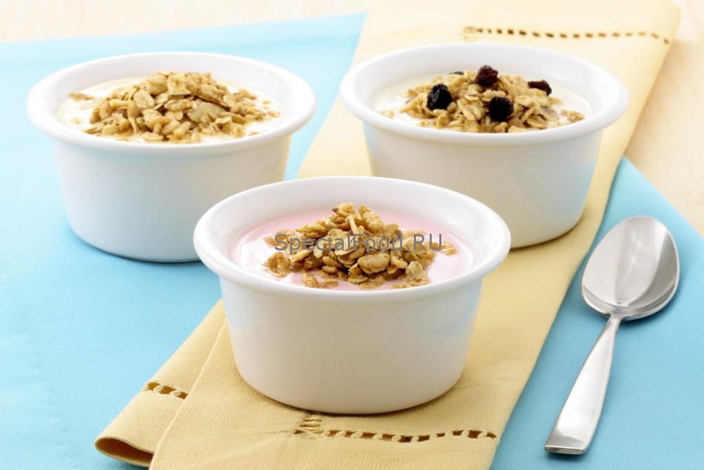 Мюсли. Также способны изменить вкус йогурта и сделать его более сытным. Хлопья становятся мягкими и тающими, что нравится очень многим детям.