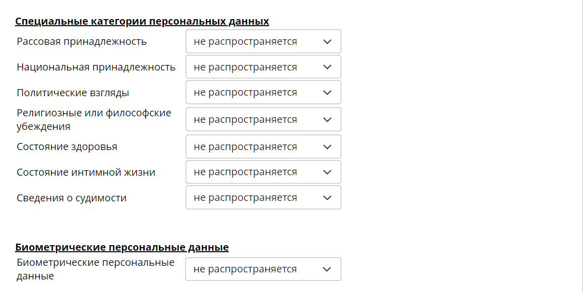 Указание специальных категорий персональных данных и биометрических персональных данных допускается в случае предварительного получения оператором, осуществляющим обработку персональных данных, согласия на обработку персональных данных в соответствии с требованиями статей 9, 10, 11 Федерального закона от 27 июля 2006 г. № 152-ФЗ «О персональных данных».