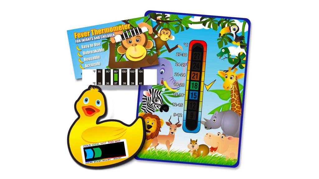 Представляет собой прямоугольную, гибкую пластинку с нанесенной на нее термочувствительной полоской с цифровыми делениями. Прикладывая ее ко лбу ребенка, можно видеть, как цифровые деления меняют свой цвет. Точность данного метода не очень хорошая, его лучше использовать для быстрого понимания наличия или отсутствия жара у ребенка.
