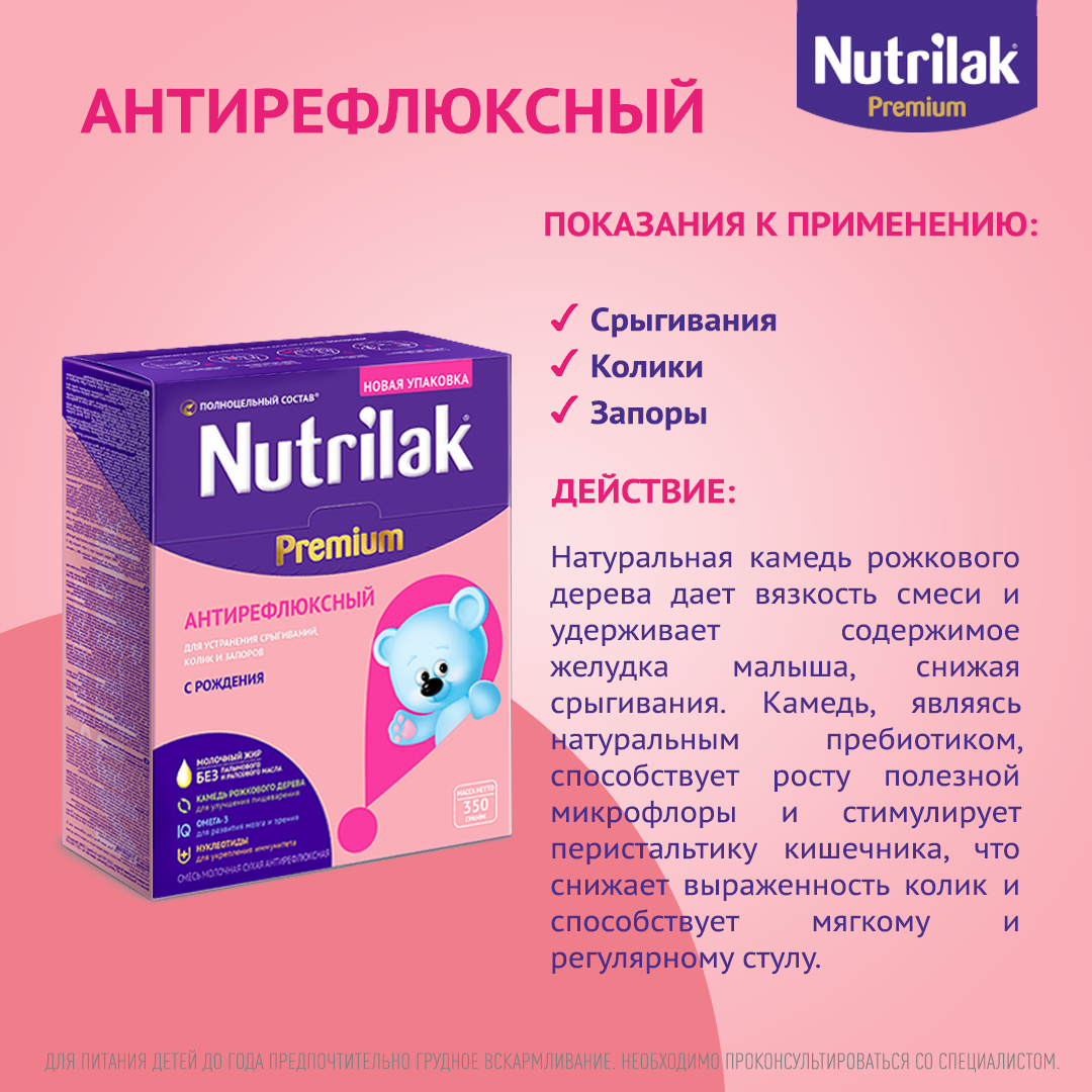 Смесь антирефлюксная детская Nutrilak Premium антирефлюксный содержит натуральную биоорганическую камедь рожкового дерева из Сицилии. Благодаря высокому содержанию активных волокон из камеди (89 %) смесь можно разводить водой обычной температуры 37–40 градусов, что удобно маме. В ней нет пальмового масла, которое негативно влияет на процессы пищеварения. Вместо него присутствует натуральный молочный жир, который является источником бета-пальмитата, способствующего комфортному пищеварению.