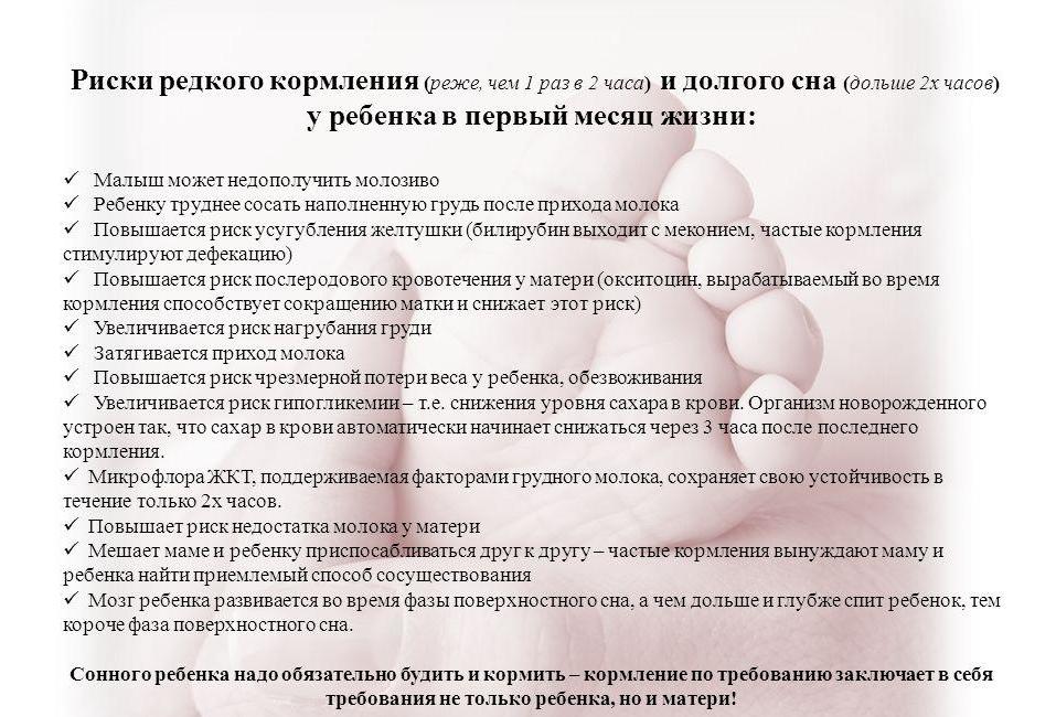 6. Малыш не спит ночью. На самом деле ребенок в первые месяцы не должен пропускать ночные кормления, прикладывание к груди в период между 3 и 8 часами утра важны для лактации. Если малыш спит больше 4 часов, то его стоит будить. Для этого достаточно поймать момент, когда кроха возится, и попробовать дать ему грудь. Сонные детки хорошо сосут.
