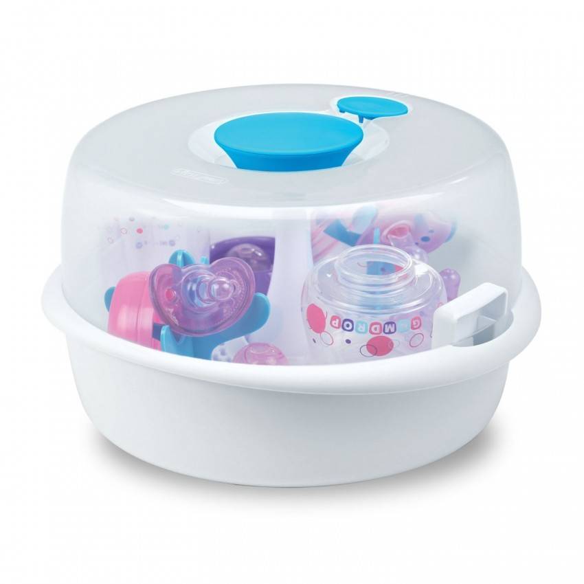 Итальянское приспособление со съемной чашей предназначено для одновременной обработки пяти бутылочек. Положить в устройство можно также пустышки и другие аксессуары. Приспособление проводит стерилизацию за 3-5 минут, отличается компактностью и помещается даже в небольшие микроволновки. В комплекте поставляются щипцы для удобного извлечения горячей посуды для кормления.