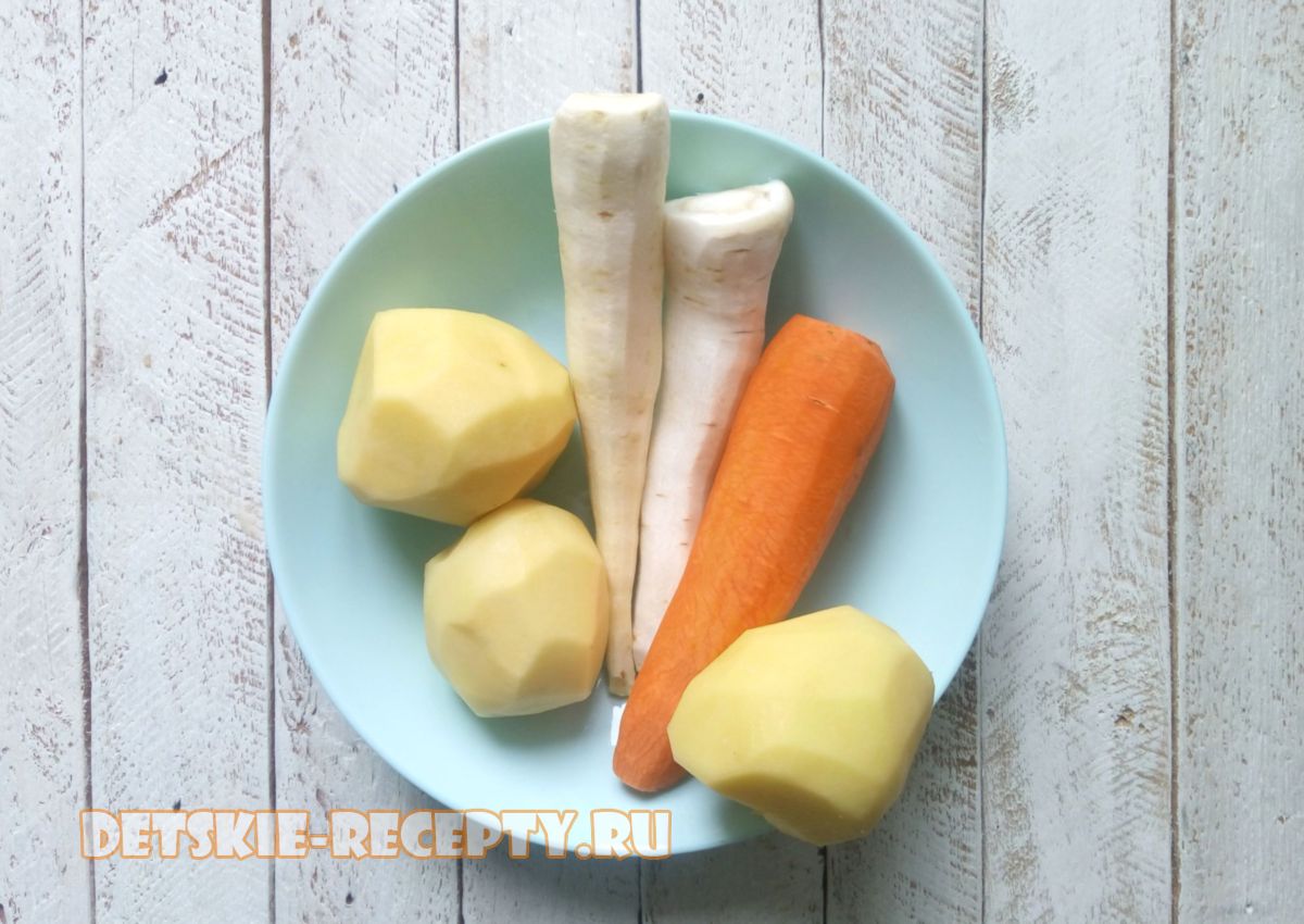 2. Пока вода закипает, снимите шкурку со всех корнеплодов. С помощью овощечистки почистьте картофель, морковь, пастернак и корень петрушки, а с луковицы просто снимите шелуху.