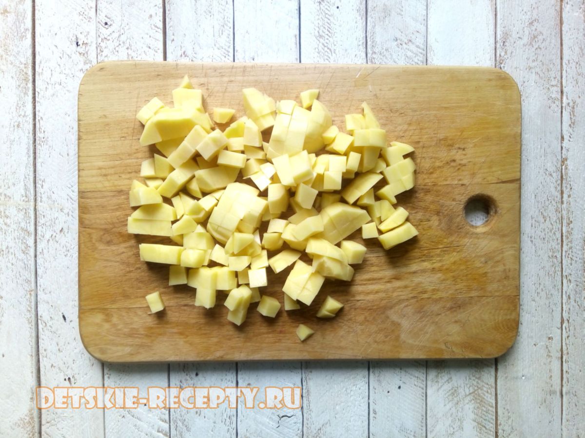 4. Если вода в кастрюле уже закипела, опустите в нее овощные кубики и приступайте к обработке следующего ингредиента – нарежьте картофель кубиками размером до 2 см (чтобы малыш смог самостоятельно есть такие кусочки).
