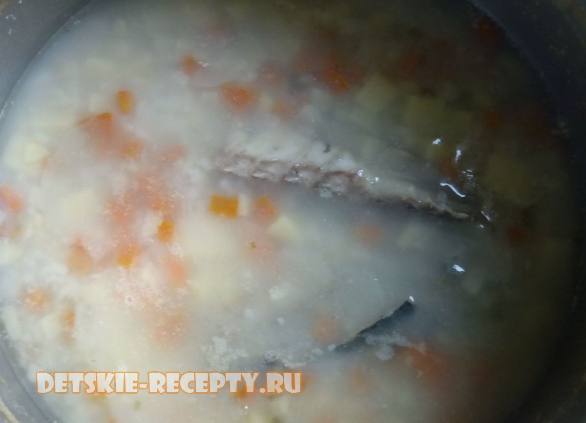 5. Перенесите кубики картошки в суп и варите блюдо дальше, посолив его.