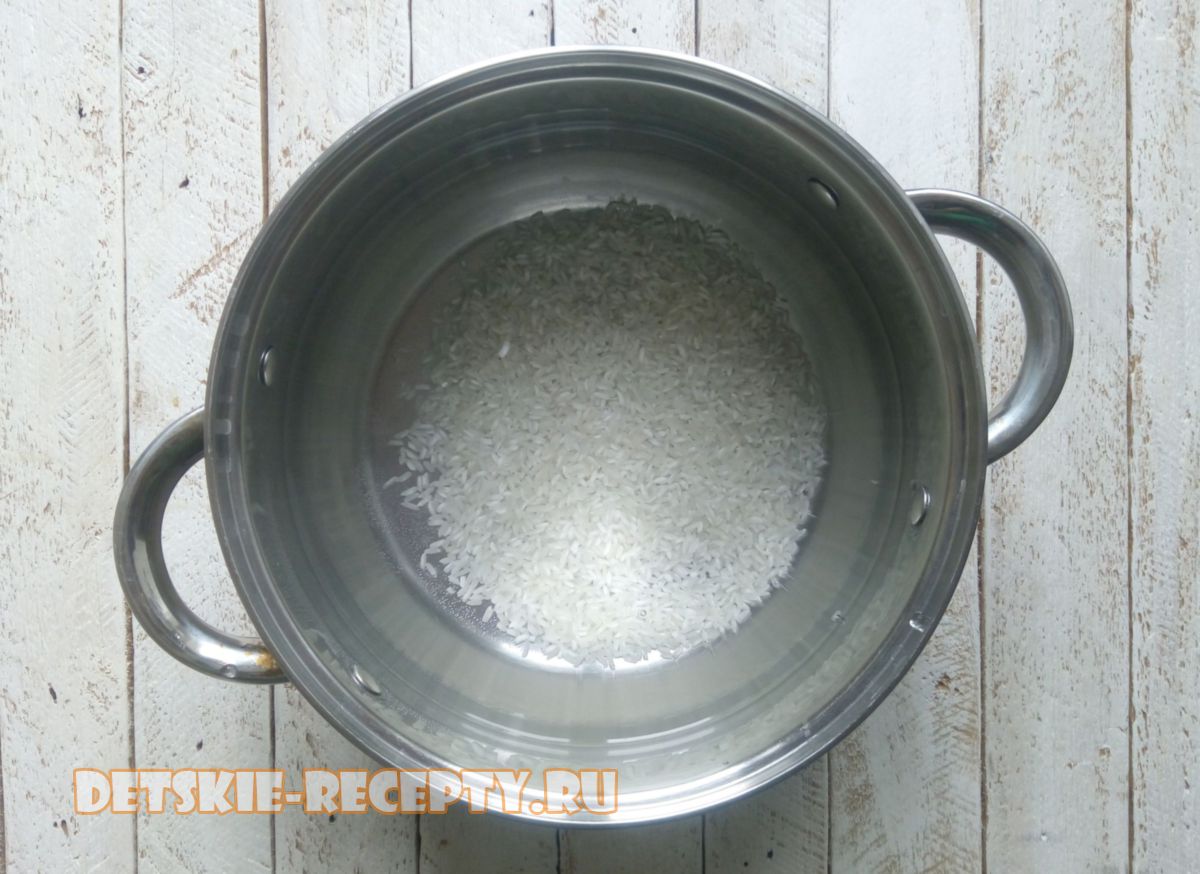 1. Насыпьте в кастрюлю рис, несколько раз промойте его под проточной водой и слейте лишнюю воду. Залейте рис чистой водой для супа и поставьте на средний огонь.