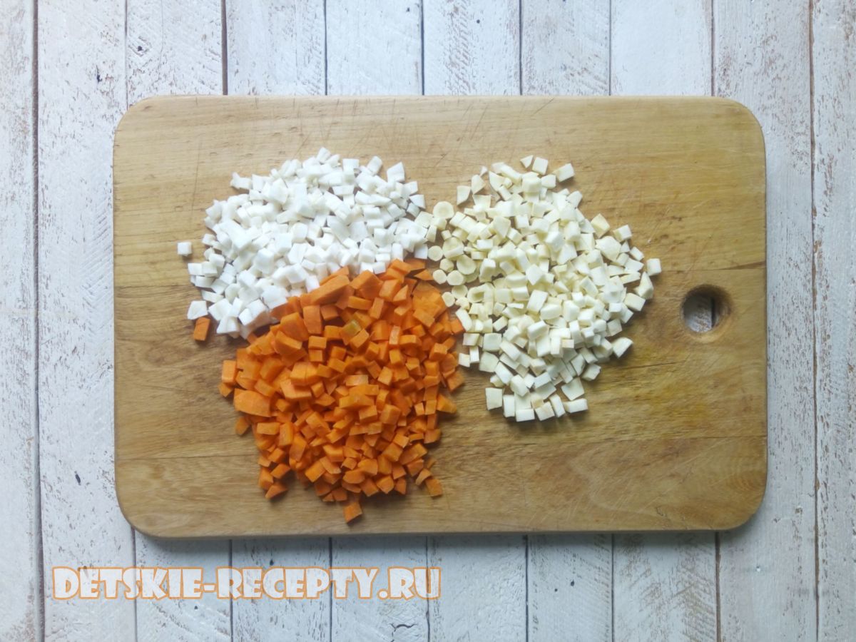 3. Вкуснее всего получаются те первые блюда, в которых овощи нарезаны мелкими кубиками. Тертая морковь, например, может очень быстро развариться, превратив весь суп в «размазню». Поэтому лучше всего – нарезать маленькими кубиками (буквально по 3-5 мм) три овоща: морковку, корневую петрушку и пастернак.