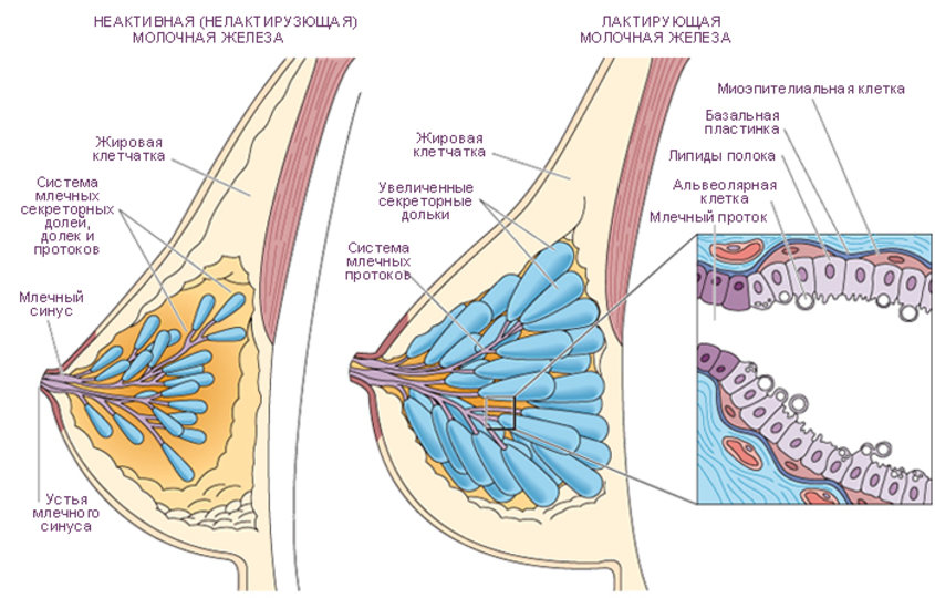 - неправильную работу мышечных волокон, окружающих лактоциты – клетки, в которых происходит синтез молока (именно мышцы помогают выталкивать молоко и перемещают его по протокам);
