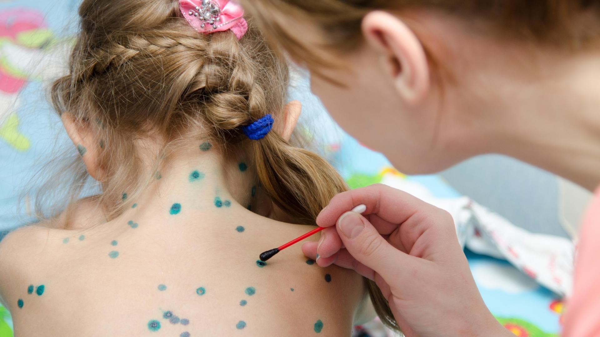 Сыпь от ветрянки можно не мазать. Зелёнкой папулы помечают, чтобы отследить, когда перестанут появляться новые высыпания — это будет значит, что болезнь отступает