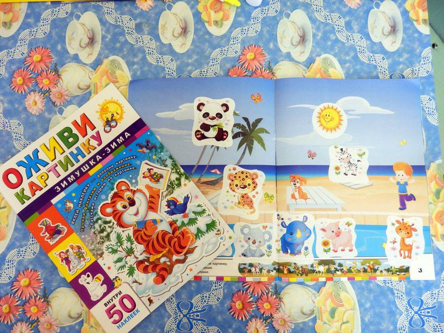Суть игры: «Оживить» картинку, то есть на цветное изображение наклеить подходящие по тематике картинки, а затем сочинить историю про персонажей. В этой серии на каждом развороте формата А4 — красивый пейзаж. Бумага гладкая мелованная, сочные цвета. Очень приятно взять в руки такую книжечку.