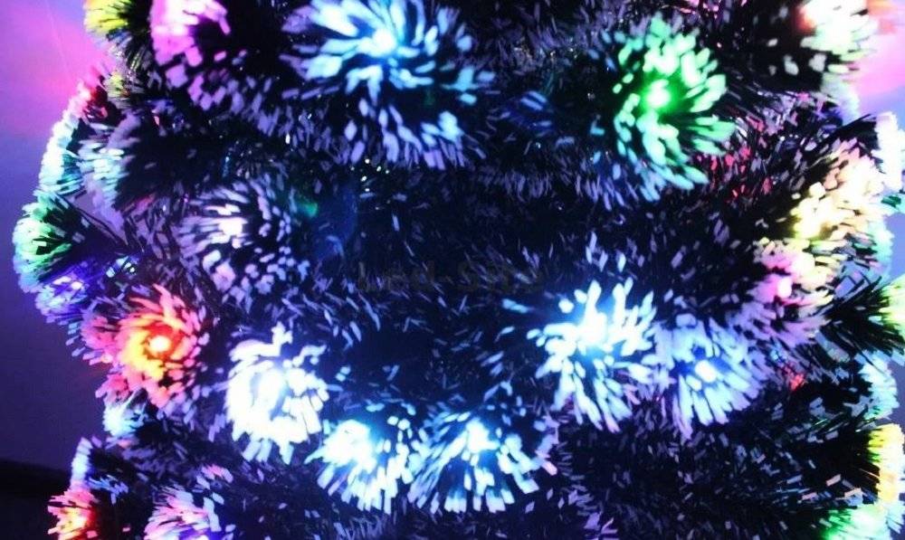 - Оптоволоконные ёлки. В ветви искусственной красавицы встроили нити оптоволокна, через которое проходит свет. Получается, что светится не гирлянда, как в обычных ёлках, а сами иголки. Безопасность обеспечивается электроснабжением ёлки через адаптер с минимальным напряжением. Производятся такие деревья в основном в Китае, а цена красавицы немного превосходит среднюю. Производитель гарантирует, что срок службы ёлки превысит 10 лет. Искусственные ёлки отличаются многообразием размеров, цветов. Можно подобрать маленькое деревце, настольный вариант или двухметровую красавицу, все зависит от вашего желания. Разнообразие цветов позволит выбрать подходящую в любой интерьер ёлочку. Выпускают ёлки как естественного зеленого цвета, так и экстравагантного серебристого, голубого, декорированные шишками, снежинками.