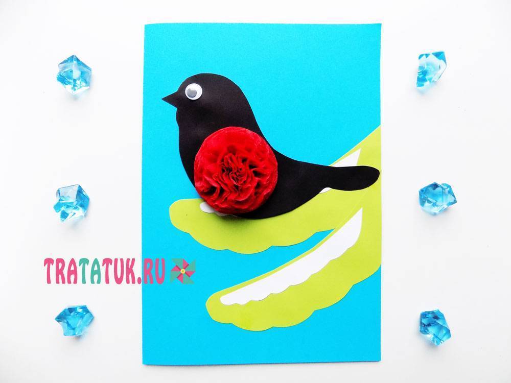 В первую очередь собираются крылья. Они состоят из черной основы и серого фрагмента возле основания, чтобы крыло не сливалось с телом. По желанию можно слегка прорисовать перышки маркером. Затем к туловищу птицы приклеивают красную грудку. И только после этого поверх грудки приклеивают крылья. Глаза можно изобразить при помощи корректора и маркера или приклеить по небольшой блестящей бусине.