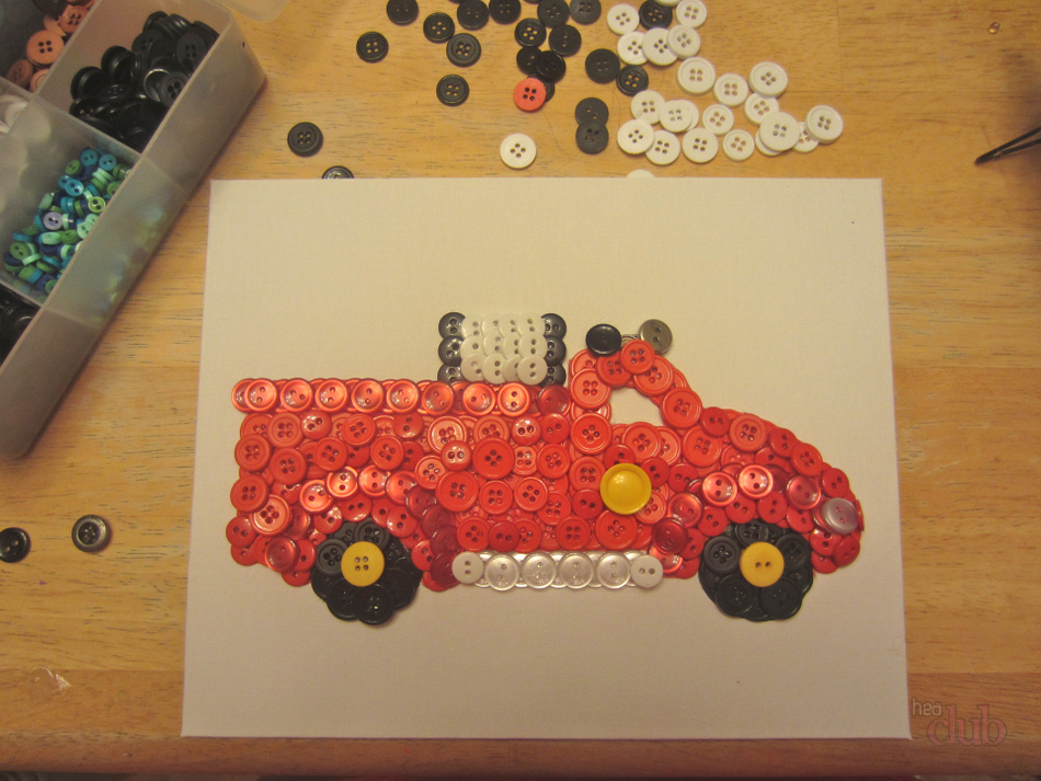 С детьми постарше пуговички можно клеить на клей, а вот при работе с маленькими лучше приклеить на пуговицы двусторонний скотч. Если их много и возможности приклеить на каждую скотч нет, можно приклеить на картон пластилин, а на него уже вдавливать пуговицы. Картон лучше использовать глянцевый, т.к. на матовом могут проступить пятна от пластилина.