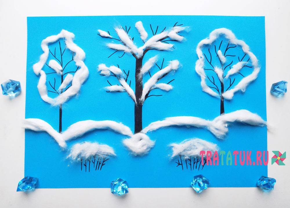 Сугробы начинают приклеивать от центра листа и постепенно опускаются вниз. Элементы накладывают друг на друга, тем самым придавая работе объема, а снегу воздушности. Клеить внахлест необходимо еще и для того, чтобы избежать фоновых просветов.